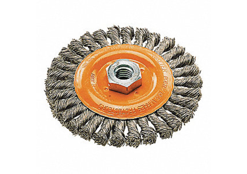 Stainless knot-twisted wire wheel brush is equipped with threaded arbours for quick and easy mounting. Knot-twisted and double-row brush is for surface cleaning after welding, to remove scale, spatter, rust and corrosion.